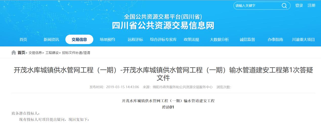 四川省绵阳市政务服务和公共资源交易服务中心在开茂水库城镇供水管网工程(一期)-开茂水库城镇供水管网工程(一期)输水管道建安工程第1次答疑文件以及第2次答疑文件中明确指出: