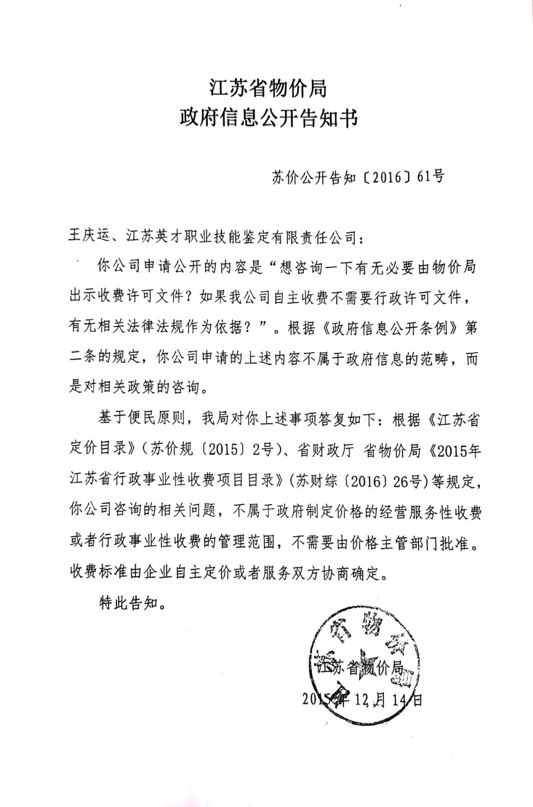 2015年12月,江苏省物价局曾回复JYPC有关证书收费的咨询,书面答复如下:“根据《江苏省定价目录》(苏价规〔2015〕2号)、省财政厅 省物价局《2015年江苏省行政事业性收费项目目录》(苏财综〔2016〕26号)等规定,你公司咨询的相关问题,不属于政府制定价格的经营服务性收费或者行政事业性收费的管理范围,不需要由价格主管部门批准。收费标准由企业自主定价或者服务双方协商确定。”由此可见,JYPC全国职业资格考试认证中心,作为江苏英才职业技能鉴定集团于1999年创办的发证机构,自主定价是完全合法的。