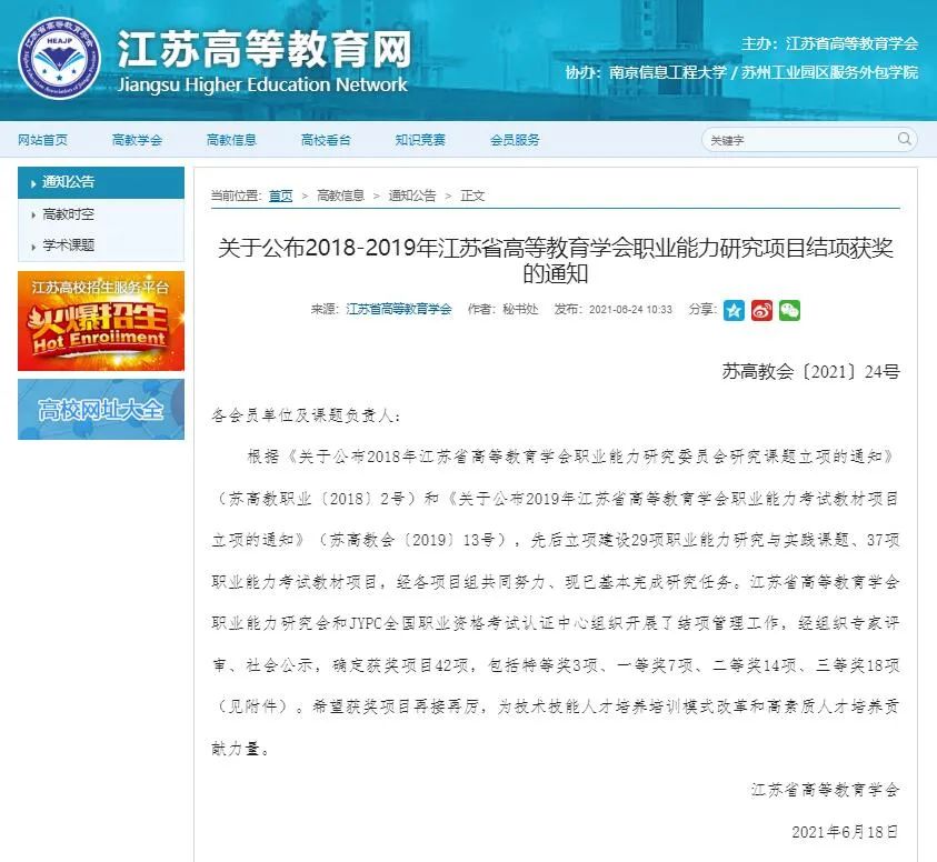 2021年6月,JYPC全国职业资格考试认证中心与江苏省高等教育学会合作,组织开展了职业能力教材课题研究立项工作,经组织专家评审、社会公示,确定获奖项目42项,包括特等奖3项、一等奖7项、二等奖14项、三等奖18项。